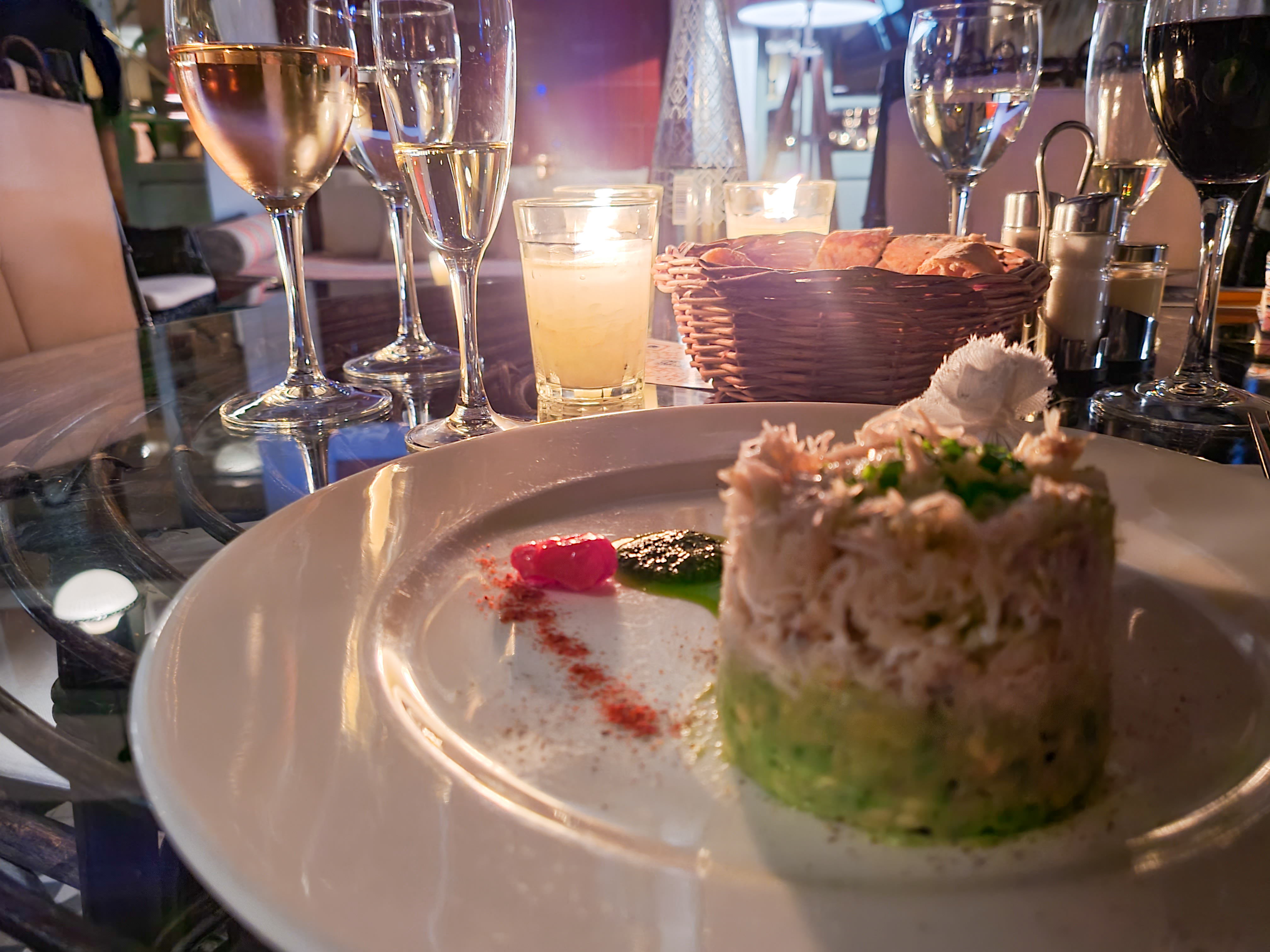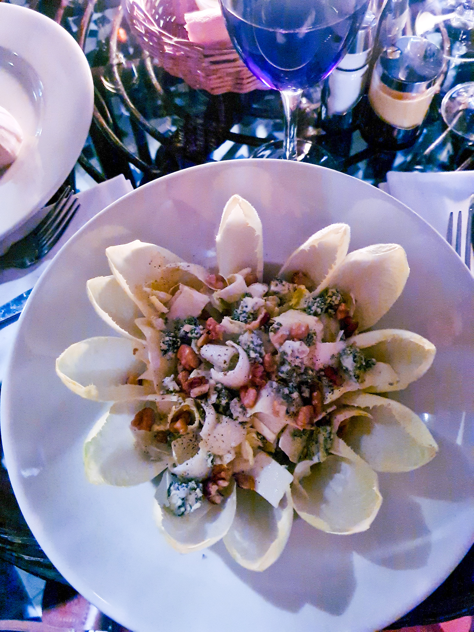 We start with a tian of spider crab from Oualidia and avocado, and a fresh salad of endives, roquefort and walnuts. The bitterness of the endives perfectly mellowed by the cheese – a classic French combination.