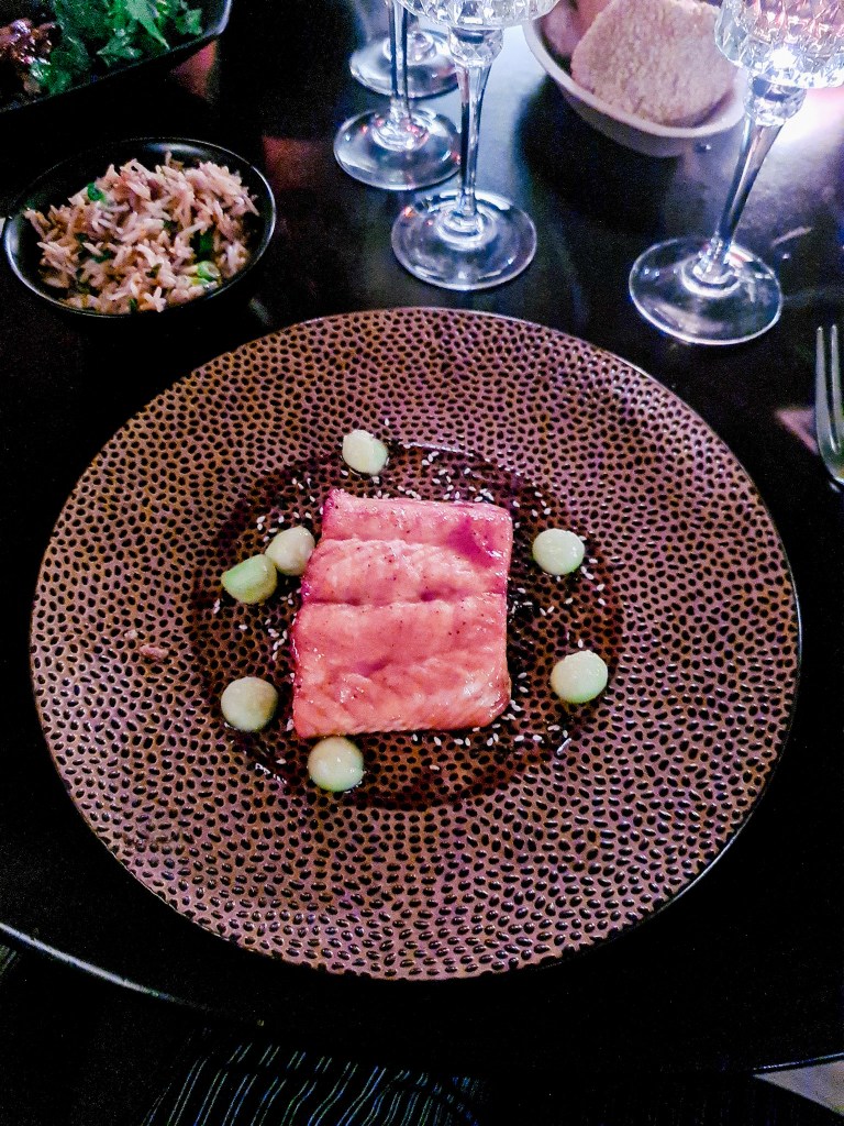For mains, I choose the beautifully emotive ‘Gazelle qui Pleure’ (the crying gazelle) – a nod to the Crying Tiger from Thai cuisine. It’s a fillet of beef marinated in tamarind and coconut sauce and accompanied by roast potatoes. We also order the mi-cuit teriyaki salmon fillet, served with pickled cucumber and the most delicious garlic fried rice accompaniment. The meat and fish are well-cooked and the flavours authentic.