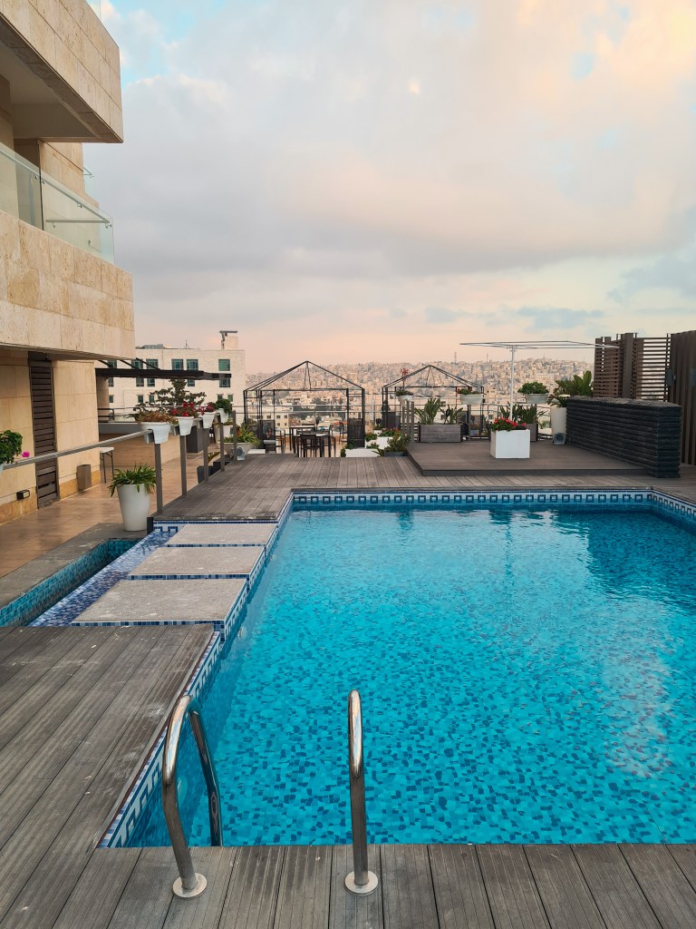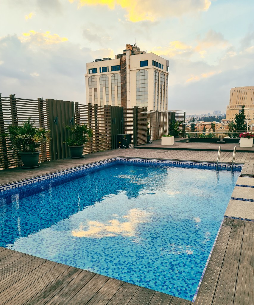 In addition to the pool itself, this communal terrace is well set-up for lively summer evenings in the city. The terrace bar serves up colourful cocktails to guests in cushioned seating areas surrounding the pool, and it’s the ideal place for relaxation after a long day scaling the many hills and steps of Amman.
