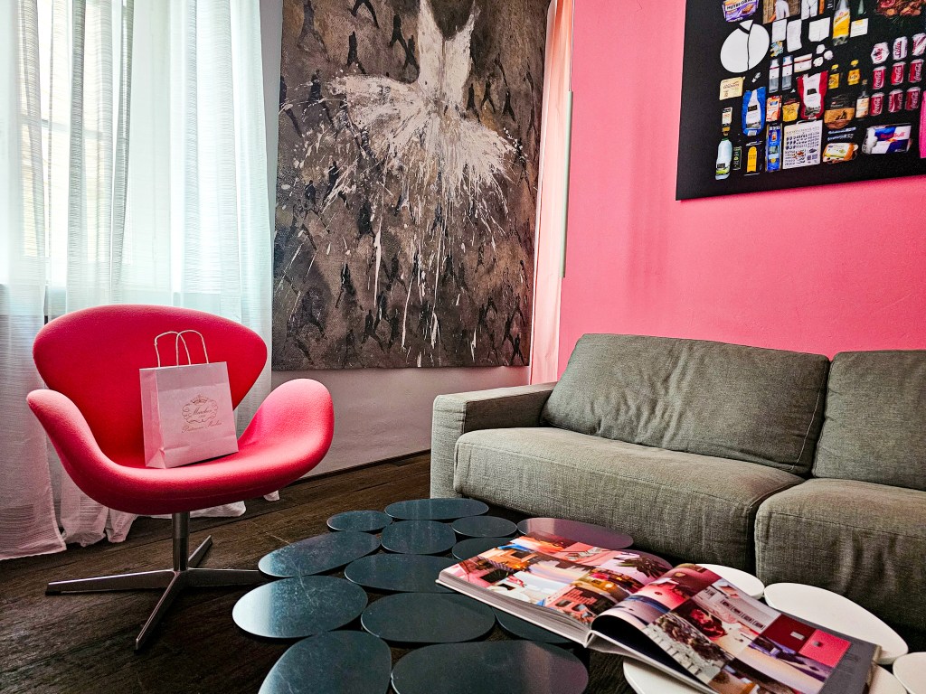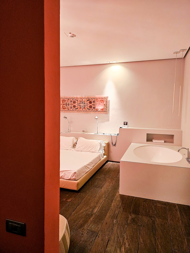 We’re staying in Suite number eight; a bright sanctuary in hues of pink and white, and flooded with light from Via San Tomaso. The suite is open-plan with a partition wall separating the sleeping and sitting areas. As with the other rooms, it’s clean, fresh and simple with bold design accents in the form of vibrant armchairs, a statement coffee table, and the real star of the show: a huge taupe jacuzzi bath in the corner.