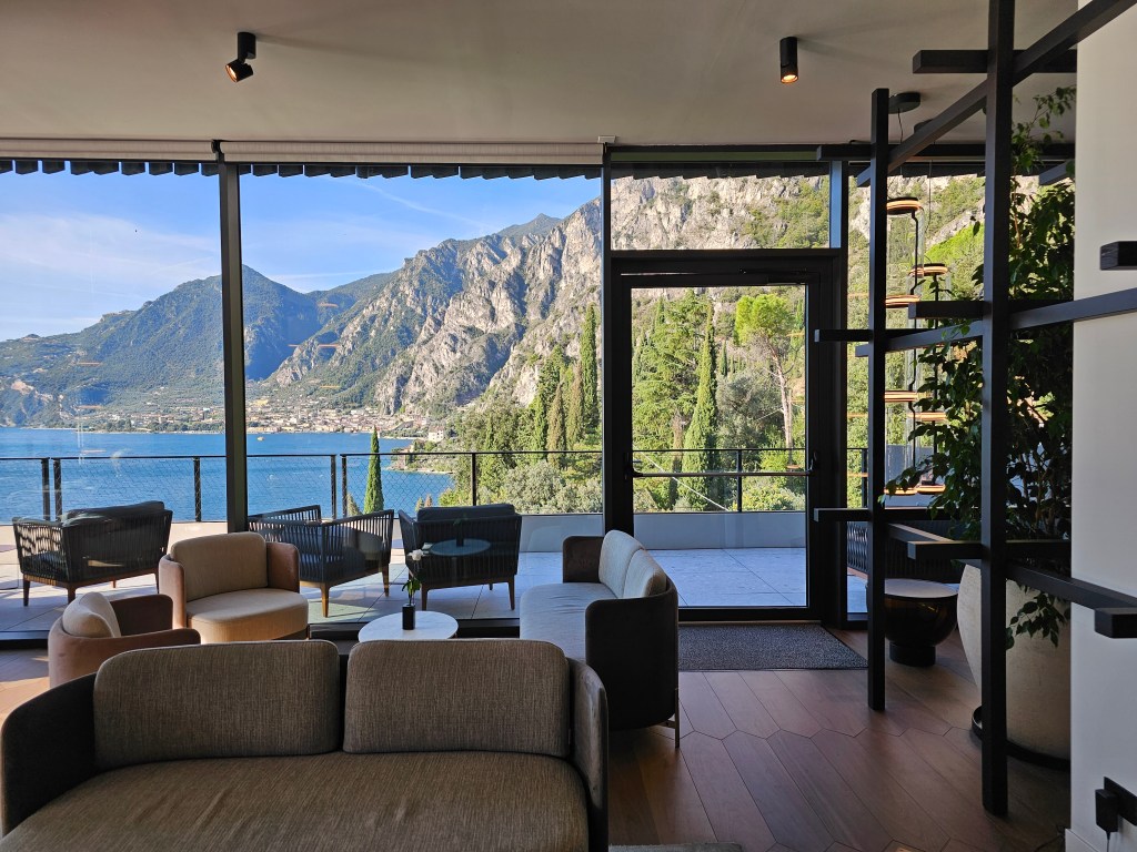 Our first stop is the reception bar’s outdoor terrace for a welcome cocktail. It’s late autumn and we’re nearing the end of the season – the perfect time to take in the view in peace, watching the passenger ferries make their regular trips from the south of the lake to Riva del Garda at the north.
