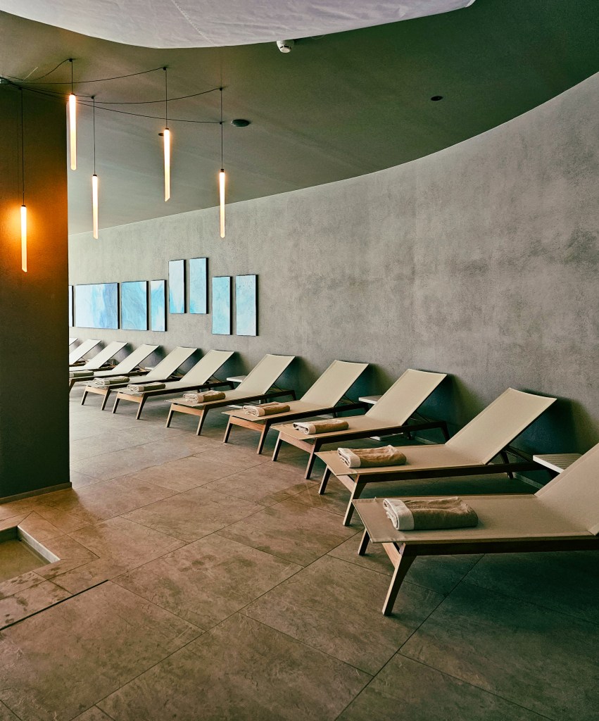 The spa area is softly lit, creating an atmosphere of deep relaxation. The panoramic sauna and relaxation room have views over the water and are bright with natural light. A further relaxation space is stocked with freshly-made herbal teas, infusions, and a small snack bar of dried fruits. There’s more than enough variety on offer to spend a full day in the spa, so the sustenance is welcome.