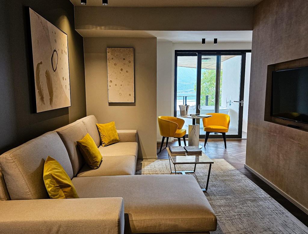 Our host leads us down several levels to our suite, which is truly awe-inspiring. A large sitting room space leads to an enormous terrace that stretches the length of the suite and features a jacuzzi bath directly overlooking the lake and rugged mountain landscape. The terrace is accessible from both the living room and bedroom, which have separate French doors. The bedroom is a calming space in muted colours, and a glass partition wall separates it from a huge marble bathroom with walk-in double shower. A standalone bath sits behind the glass partition, enjoying uninterrupted lake views.