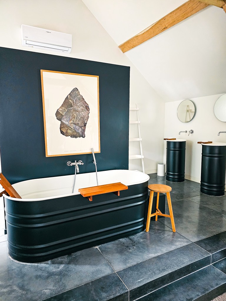 The Fontenay suites are duplexes, a spiral staircase connecting the two levels. Upstairs, the pièce de résistance is a striking standalone bath in black enamel in the centre of the room – part of an open-plan bathroom.