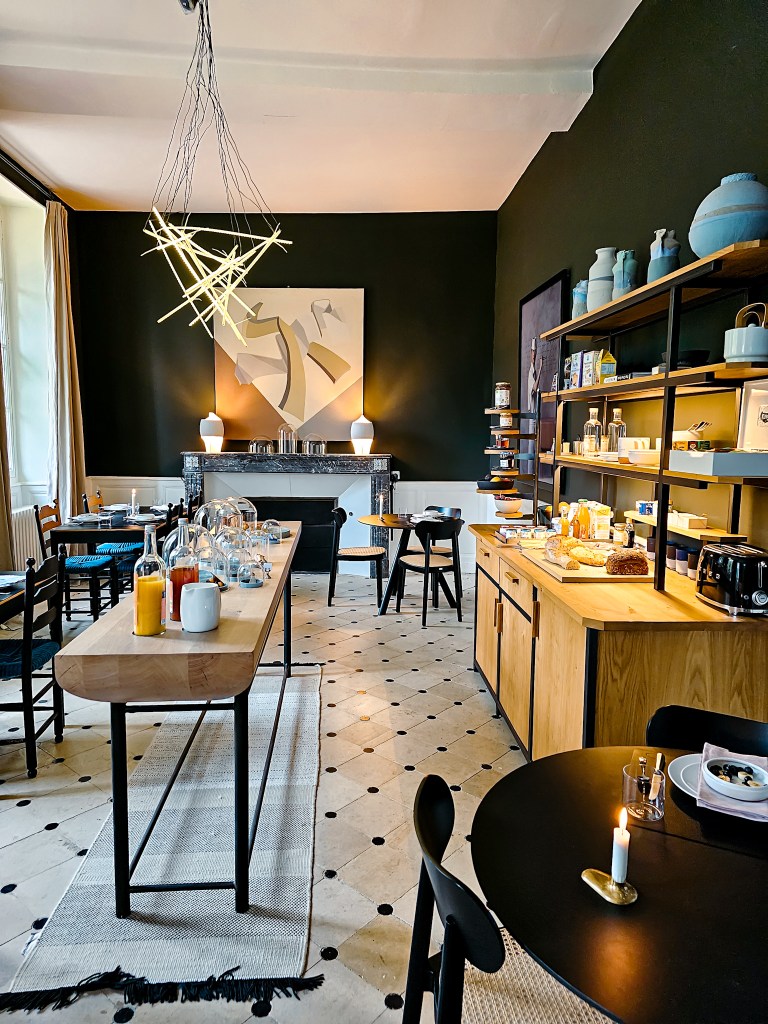 Breakfast is served in a stylish scullery-style dining room in bottle green. Statement lighting illuminates a breakfast bar filled with pastries and cakes that have arrived fresh that day from the local bakery. There is a continental selection in the form of local meats, cheeses, and eggs available to order.