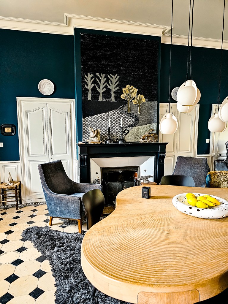 It’s a warm and inviting space in a moody shade of deep blue, teeming with character in the form of dark wood antique furniture, statement chairs and lighting, and touches of modern art.