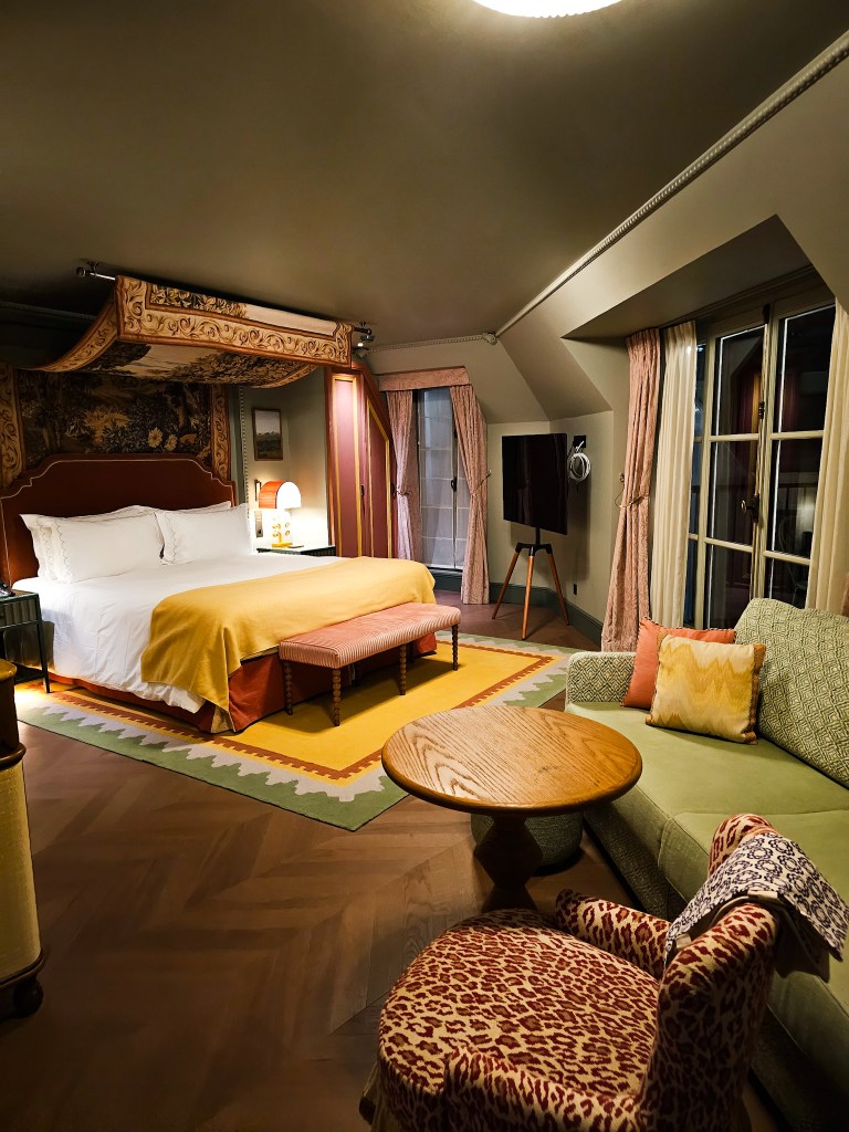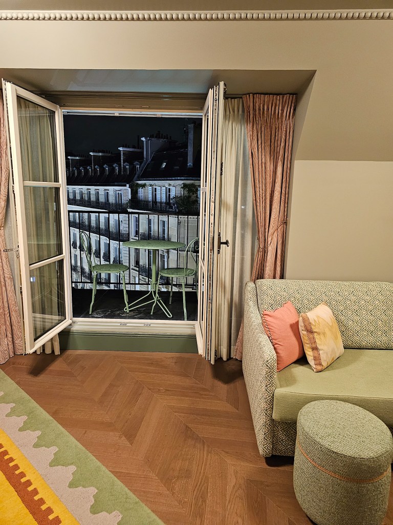 Our favourite bedroom of all isn’t the most expensive, but the Grand Parisian Junior Suite. Up a small staircase, you arrive in an attic room hardwood flooring and full-length French windows. One of the windows is open, leading out to the most perfect rooftop balcony, which is furnished with a simple table and chairs in the hotel’s signature sage green. It doesn’t look real – like something from the imagination of Amélie Poulain.