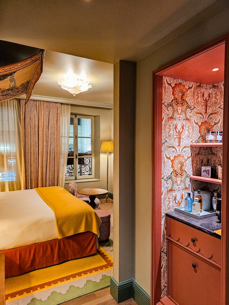 Maisons Pariente is a brand known for high-end luxury, and this is evident from the partnerships employed throughout the hotel. We were impressed to find toiletries by French luxury favourite Diptyque in the bathroom – a fitting choice as the brand is headquartered just across the Seine on Boulevard St Germain. Specially-designed vanity cases offer exceptional extras from the brand. Additional in-room treats are provided by French lifestyle brand Oh My Cream!, and the signature hues so central to the hotel’s design are creations by Farrow and Ball and Pantone. Each room contains a complimentary minibar with select premium spirits in miniature, as well as sweets, snacks, and fruit juices by French brand Alain Milliat. The hotel’s central bar is well-stocked with the best of France, such as champagne from Taittinger.