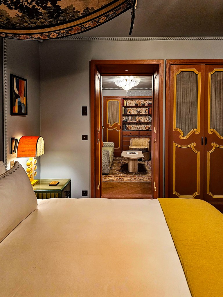 No two bedrooms are the same, and next we visit a Superior room that boasts an incredible corner location, which – when the gauze drapes are pulled back from French windows – offers views down the bustling boulevards of Le Marais.