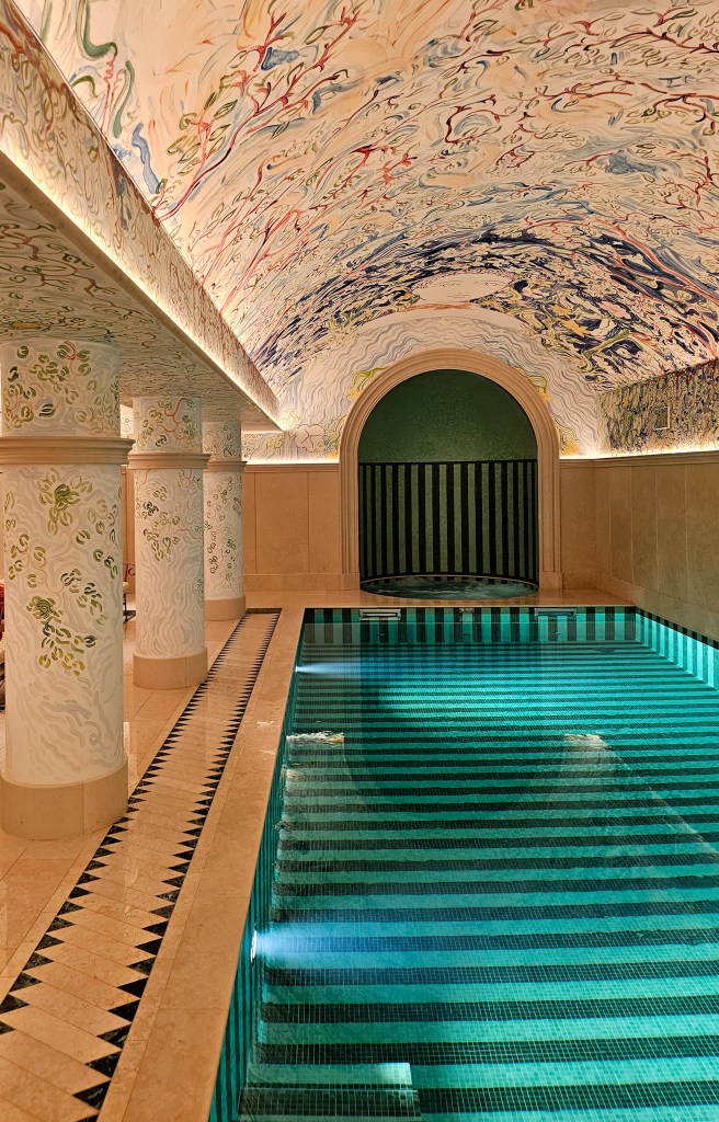 Anything you read about Le Grand Mazarin is likely to mention its picture-perfect swimming pool. It’s a warm sanctuary on the ground floor with low, vaulted ceilings that have been painstakingly hand painted in a dream-like scene by Parisian artist Jacques Merle. The pool is a shock of saccharine turquoise against contrasting vertical lines that lead to a low-lit jacuzzi grotto, while Roman columns give the impression of a bygone era. For the hotel’s opening, the pool was transformed into a magical fantasy land complete with mermaids.