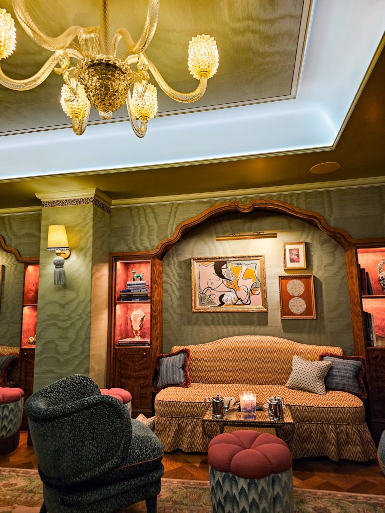 We spot continuations of the design references seen throughout the hotel, such as shell patterns on the carpet, intricate glass light fixtures and classic mouldings on the walls and ceilings that call back to the building’s historical past.