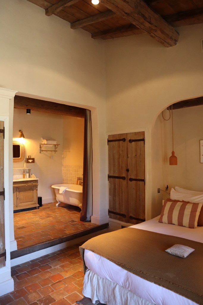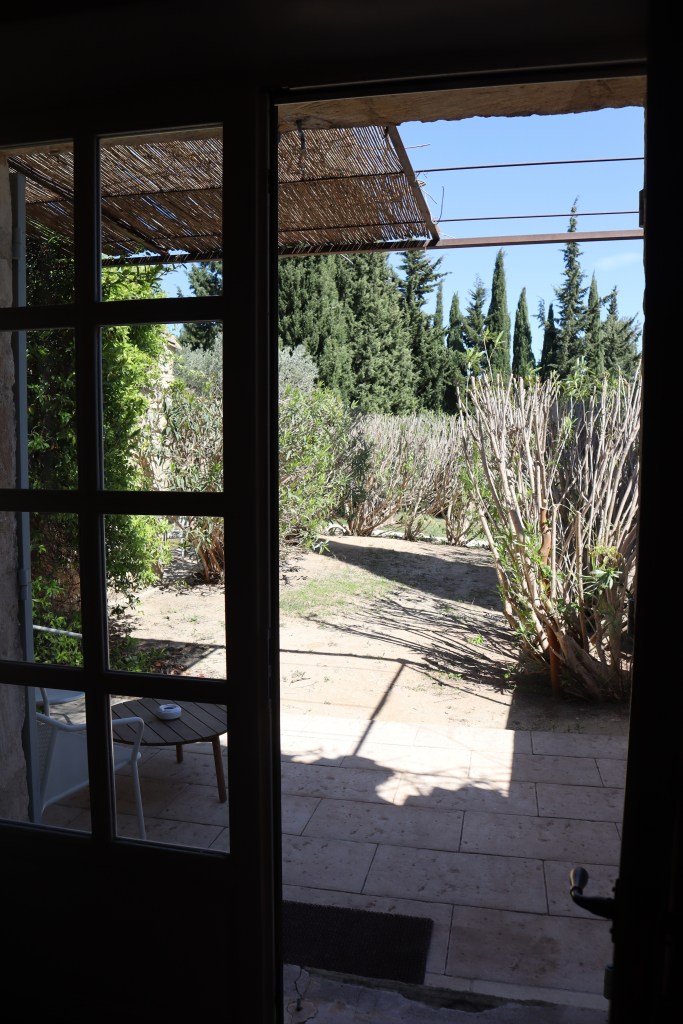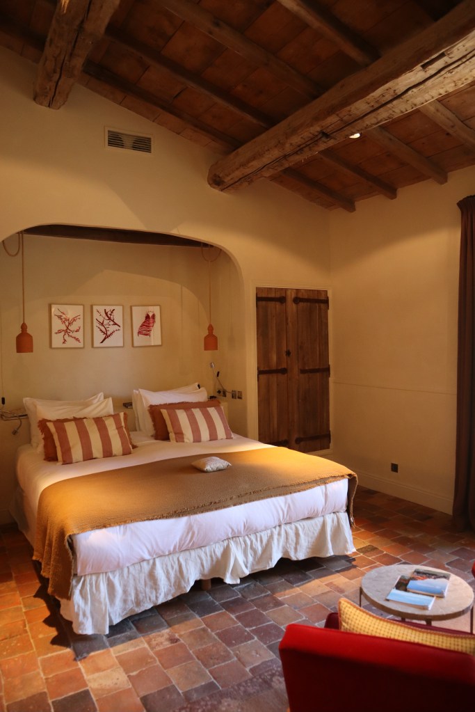 Our room is located in the Chapelle building – separate from the main property and designed to look like a historic church house. Hameau des Baux offers eight different styles of room, located in different parts of the grounds and varying in style and size. A cohesive design runs throughout the rooms: countryside comfort in a stylish colour palette of beige and rust, with accents of wood throughout. Each of the rooms boasts a rustic-style wooden beamed ceiling, and almost all have doors that open onto a private terrace.