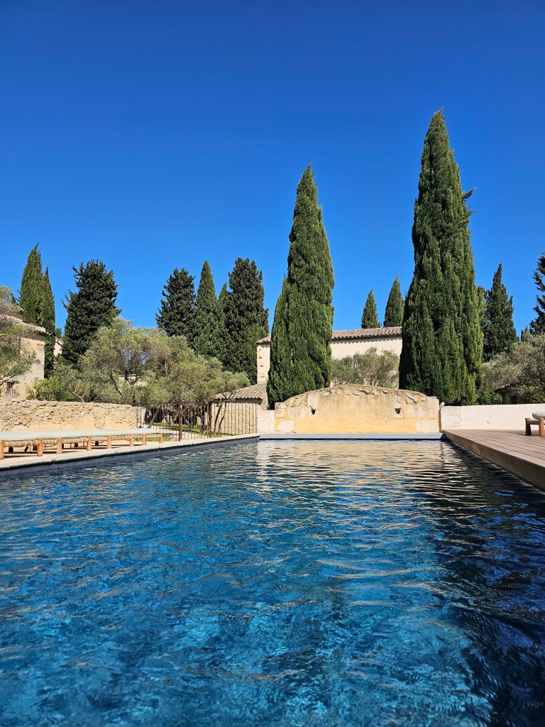 From the comfort of our daybed, we take in the idyll of the surroundings: there is complete quiet, save for the bubbling of the pool’s fountain and the rustling of the breeze in the trees; the contrast of the rolling landscape against the deep cobalt of the South of France sky is colour in the highest definition.