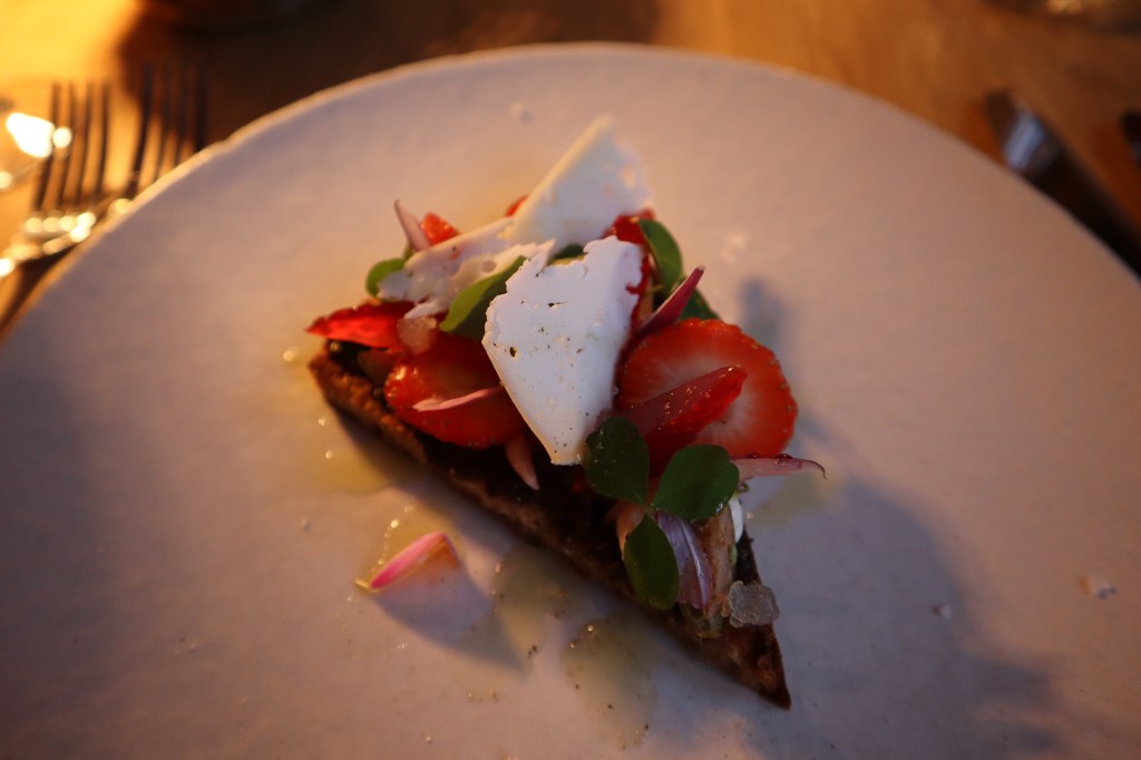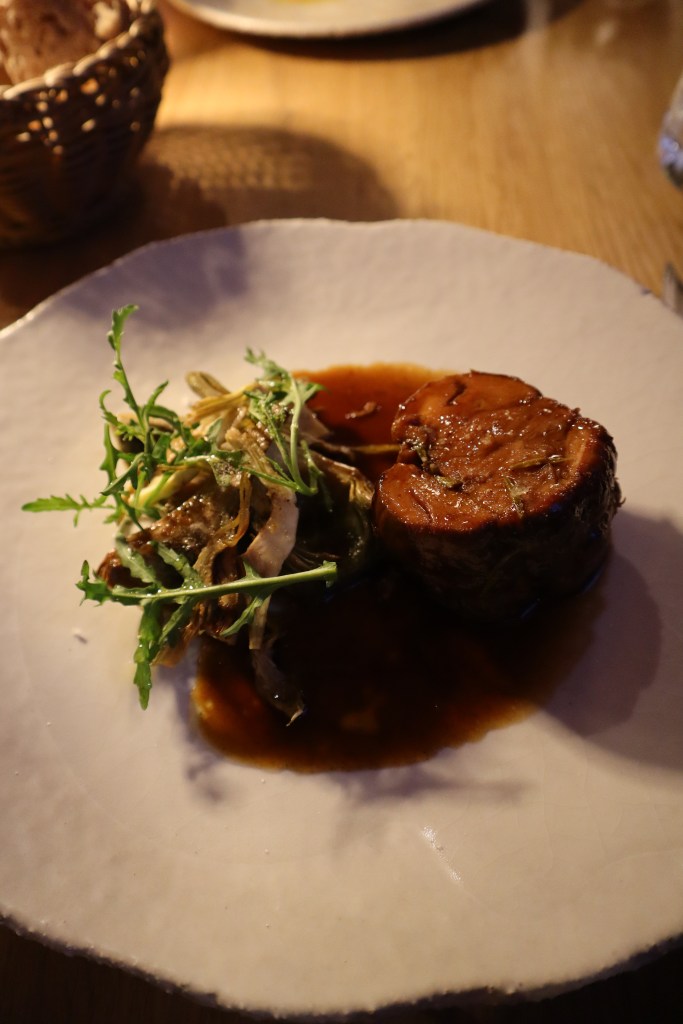 The hunk of veal knuckle we choose for our main has been marinating for the last 24h, and separates into tender flakes with ease, complemented by a salad of shaved artichokes. Asparagus is also in season during our stay, and the catch of the day is served with the vegetable cooked two ways. Overall, the meal is a flawless amalgamation of ingredients at their peak. To finish, a perfect balance of sweet and salt with a fresh rhubarb crumble featuring more of those delectable strawberries, and a cheeseboard with strong focus on goat’s cheese (our favourite is a smoked ash variety).
