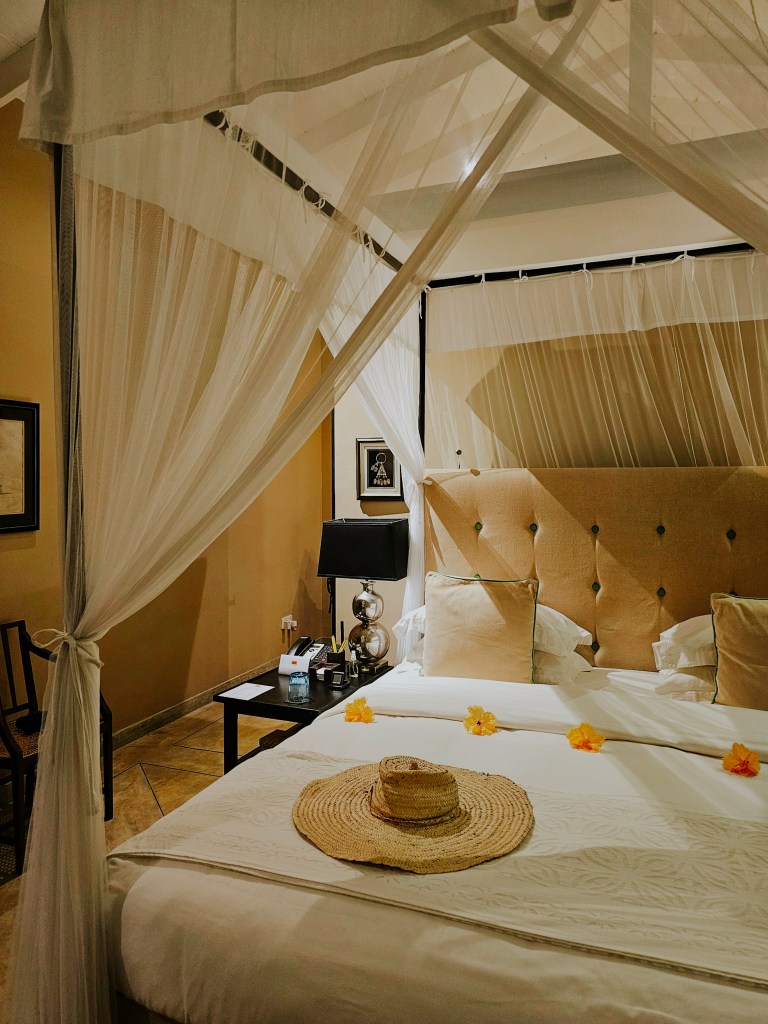 When we return to the room after dinner, we find that a turndown service has taken place, the bed scattered with fresh flowers. With the lights dimmed, the shutters closed, and the mosquito nets lowered, there’s nothing left but to settle into the softness of the luxury bedding for the night.