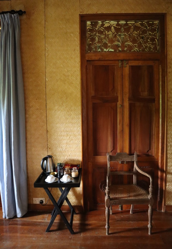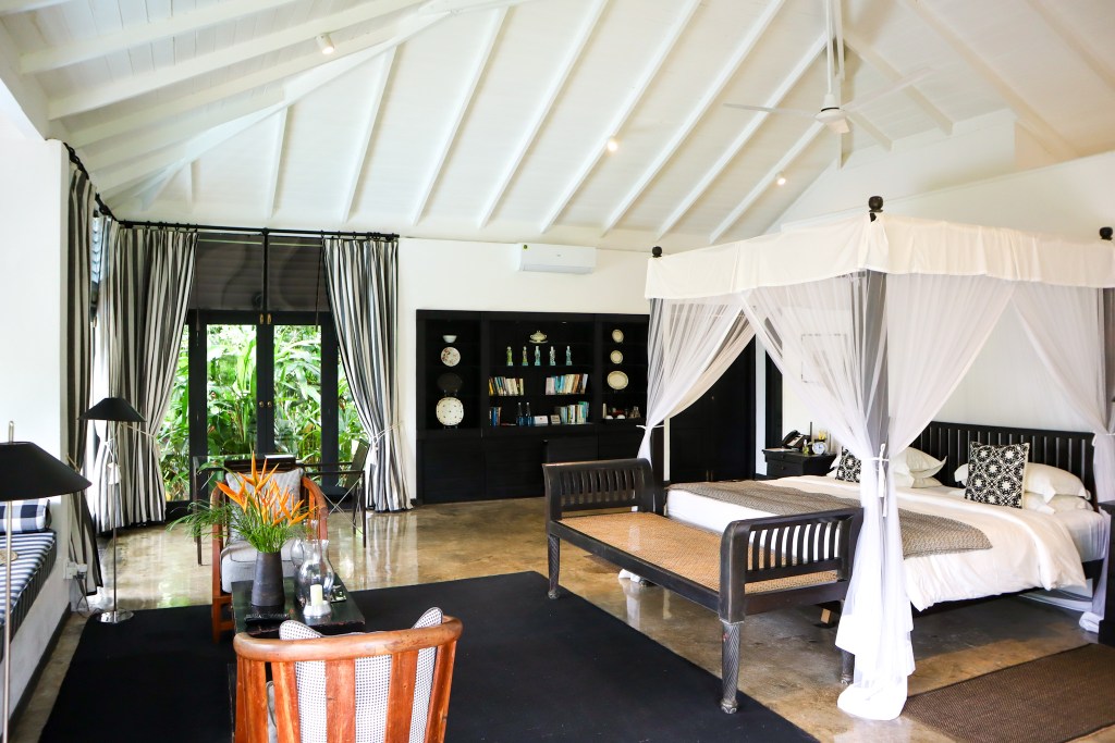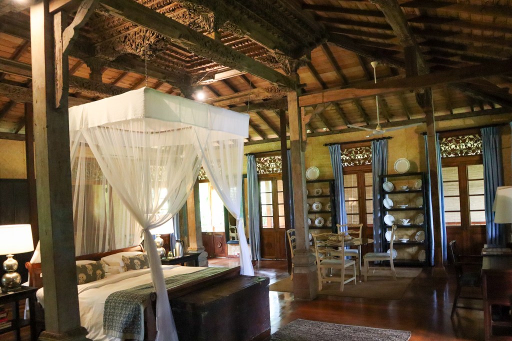 This latter suite was originally built as George’s personal home, with roof timbers, carved wood and 24 columns imported from Indonesia to recreate the aesthetic of a Joglo house. It comprises one enormous reception/bedroom, moody in dark wood, and enveloped by a wraparound verandah. A huge four-posted bed forms the centrepiece beneath the most intricate carved wooden ceiling. The décor features elements of Sri Lanka’s colonial history (a wooden dresser displaying dainty plates of bone china; vintage posters depicting the beginnings of Sri Lankan tourism) while remaining faithful to modern south Asian design.