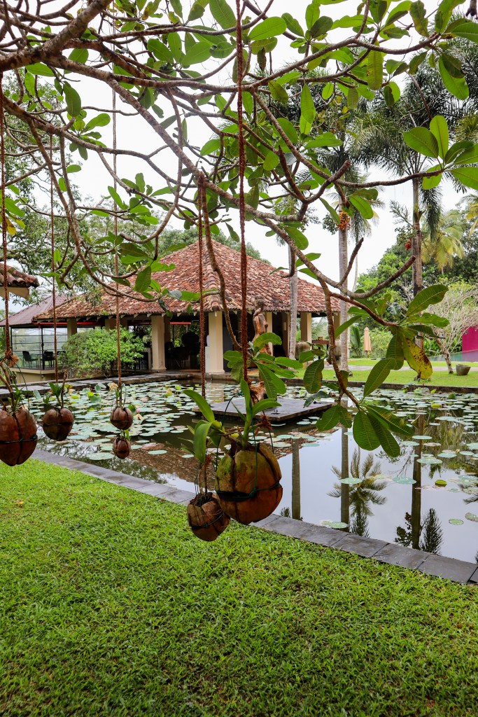 Ponds scattered with lily pads among which dozens of koi fish paddle, plants in woven baskets swaying gently from the branches of trees, statues of Kandyan monarchs paying tribute to the rich history and traditions of the surrounding land.