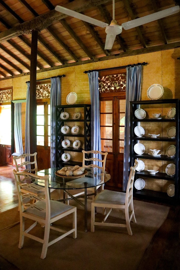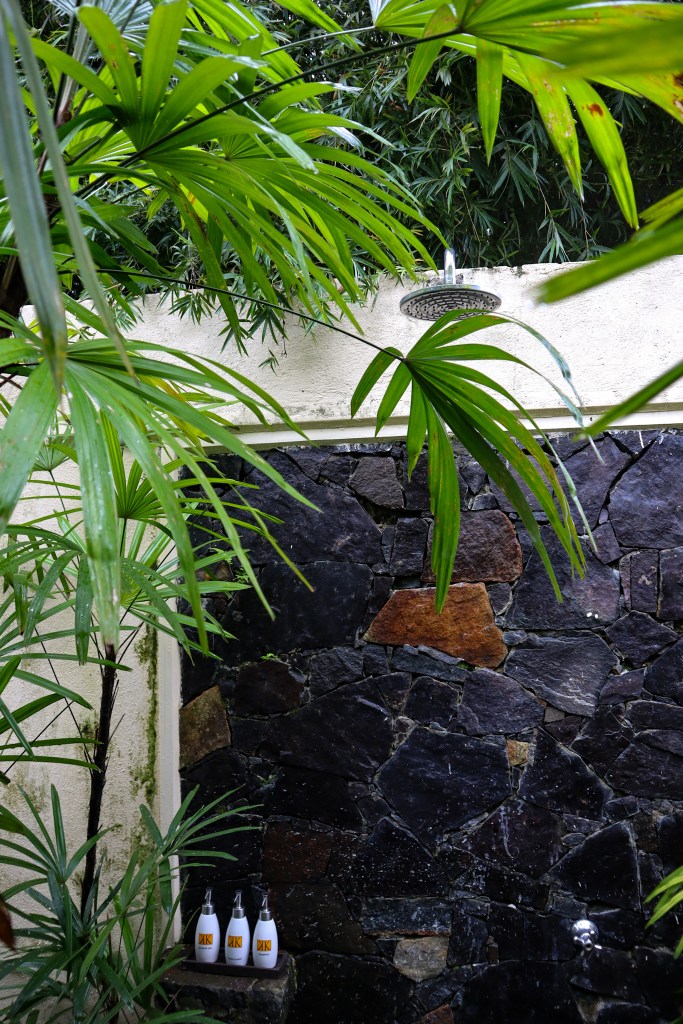 The first order of the day is a dip in our private pool – best enjoyed during a brief rainstorm when the water is pleasantly warm against the cold showers – and admiring the meticulous attention to detail, from our own personal umbrellas outside the door to his and hers linen dressing gowns and woven sun hats.