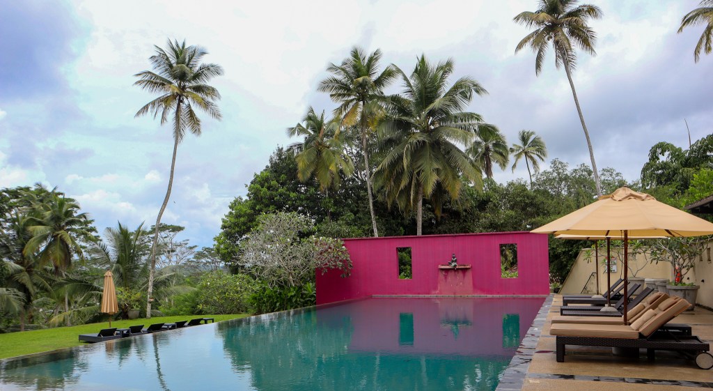 Partial walls in the garden are painted in rich pinks and oranges, chosen to reflect the different hues of the robes worn by Sri Lanka’s Buddhist monks. Subtle architectural features like angled window-frames expertly draw the eye toward the horizon.