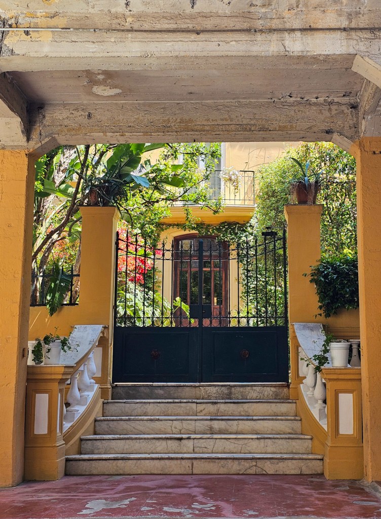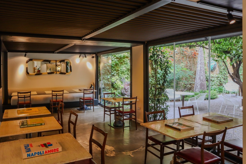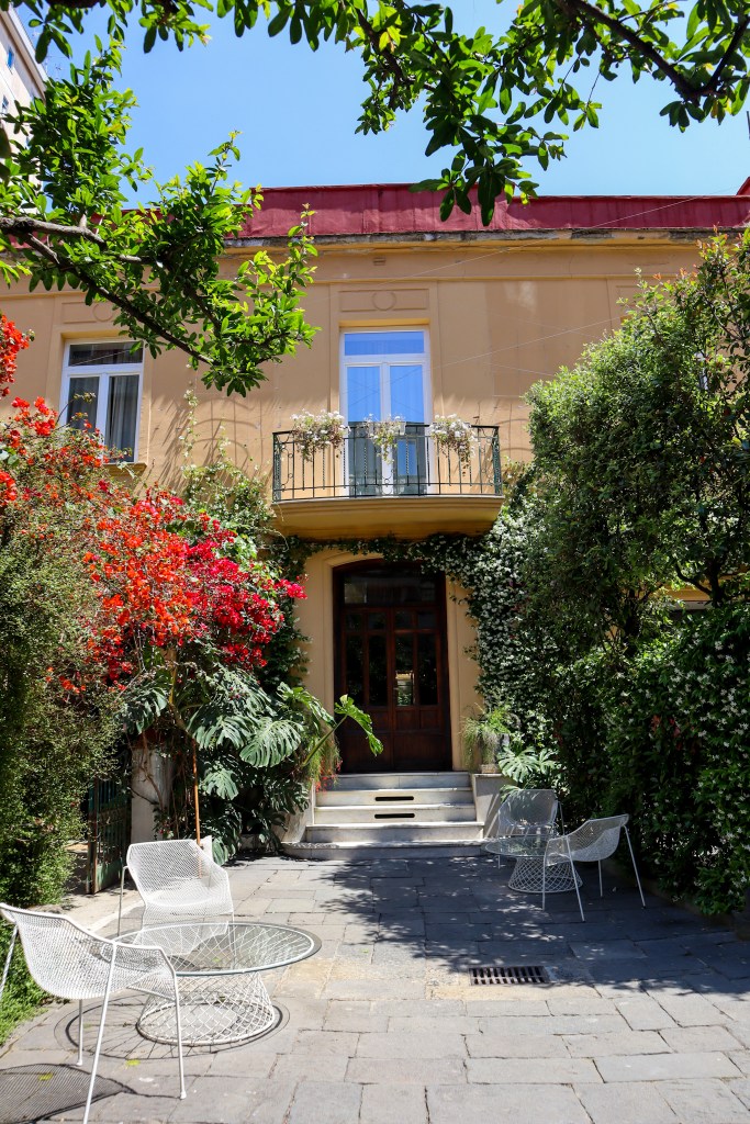 With the wrought iron gates closed behind you, shutting out the noise and frenetic activity, and you enter another Naples altogether. It’s a courtyard filled with trees, where music is playing, and where you look up and see an expanse of deep blue sky – a contrast from the narrow lanes and washing lines that characterise much of the city centre. Marbled steps lead to a beautiful house in yellow, built in 1947 by the great-grandfather of Vincenzo Oste, who still owns the house today along with his wife Inès, the jewellery designer after whom the hotel is named.