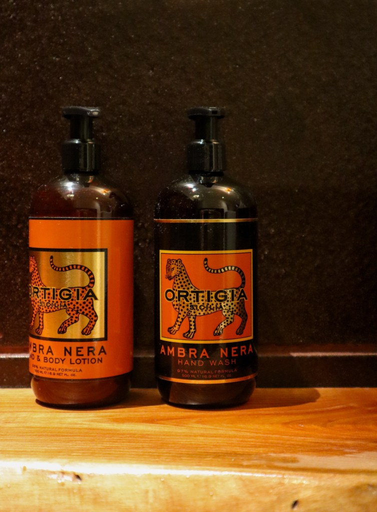 Touches throughout the suite highlight Italian quality, from the products by Sicilian brand Ortigia in the bathroom (scented in Black Amber, in keeping with the surroundings) and delectable croccantino chocolates from Autore.