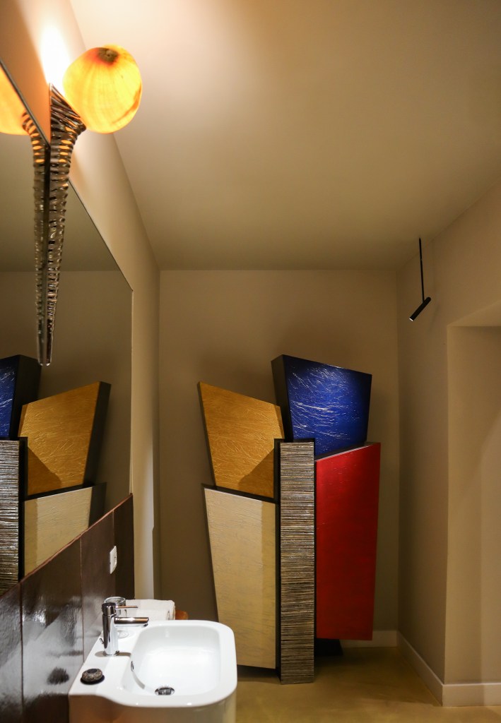 Our room, the Prototipi (Prototype) Suite is a work of art, filled with treasures designed by Vincenzo and Annibale. Serrated double doors slide open to divide the suite in two, revealing a bedroom in tones of ecru, the wall behind the bed adorned with giant clay-like forms that replicate pieces of fossilised coral. The suite – a generous space of 55m2 – is furnished in a deliberately minimal way, in the style of an exhibition space.