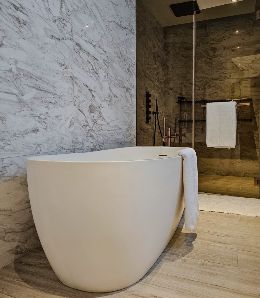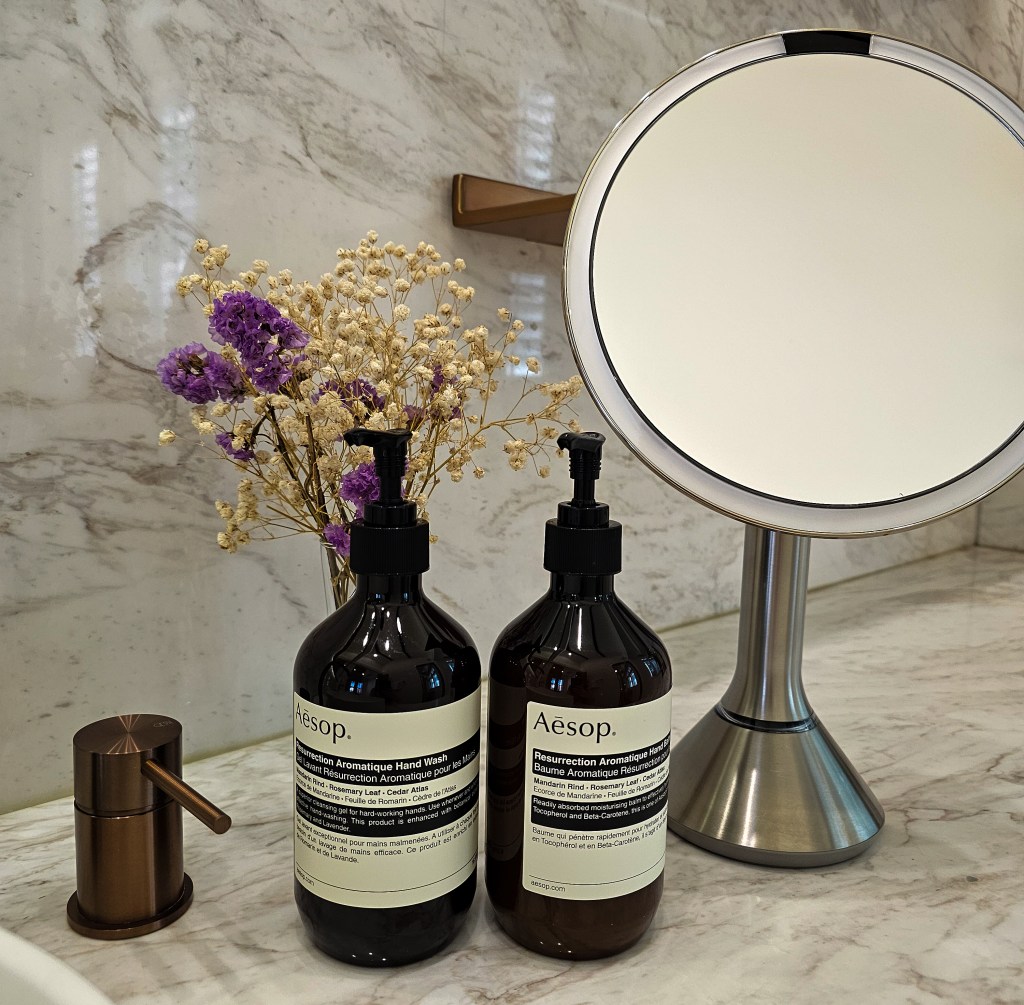 The bathroom is an expanse in marble and copper that stretches the width of the suite and contains a walk-in shower and standalone bath tub. Atop the marble surface of the double vanity unit are products from luxury cosmetics brand Aesop, dried flowers, touches such as bespoke towels for removing makeup and – wait for it – a menu advertising one of the most unique hotel amenities we’ve ever experienced: a bath butler service.