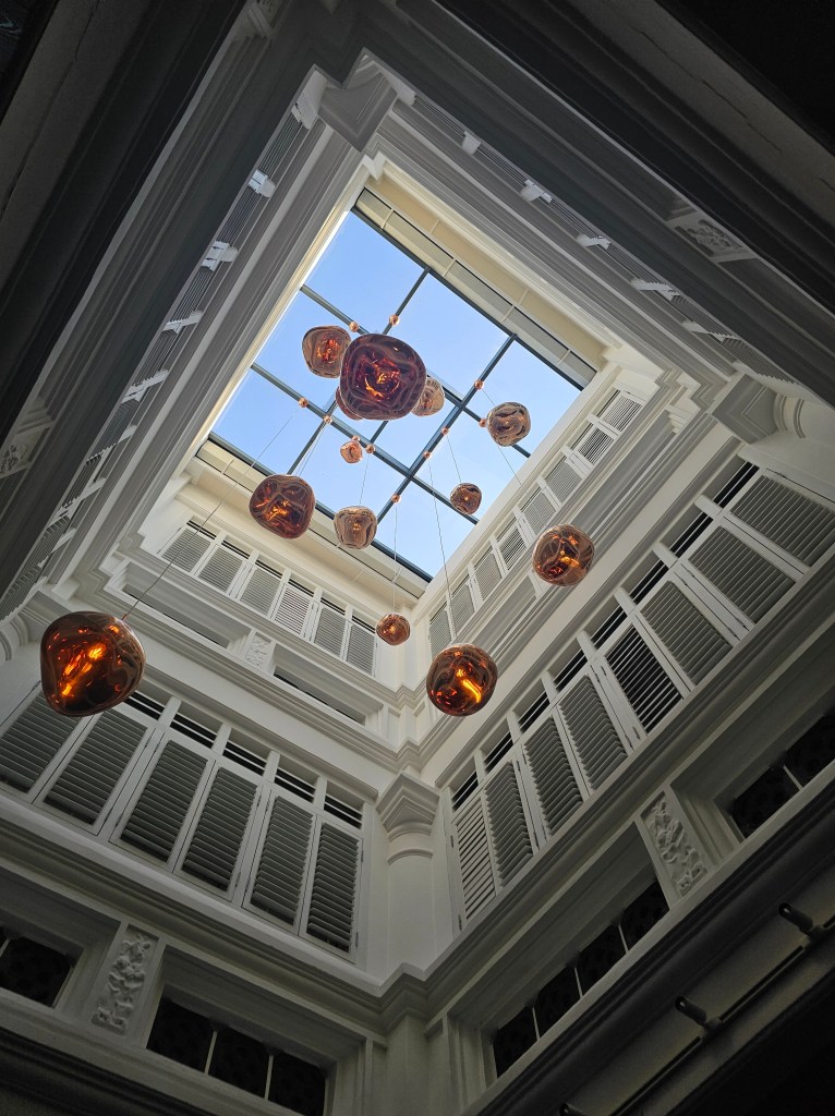 Hanging down over several floors are copper domes – a contemporary lighting feature – which glint and sparkle as they reflect the sunlight above.