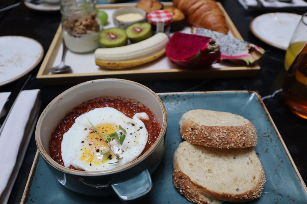 In the morning, breakfast is another above-and-beyond experience. It’s an authentic representation of the multicultural melting pot of Penang, alternating each day between western and pan-Asian fare. We’re lucky enough to sample both during our stay, first starting with the Asian variety: a multi-course smorgasbord of dim sum, dumplings, nasi lemak, Malaysian custard tarts, and fritters. The next day, the theme switches to Western breakfast and with it comes a platter of tropical fruit, pastries, overnight oats with yoghurt and shakshuka. Both breakfasts are accompanied by freshly-squeezed fruit juice and coffee.